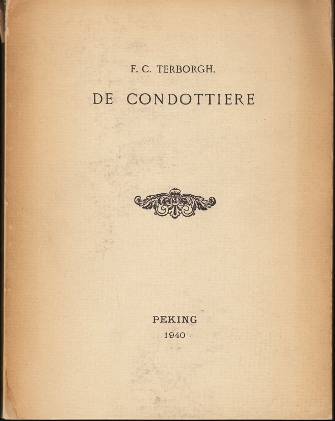 38. TERBORGH, F.C. De condottiere. Peking, Bij de Paters Lazaristen [= eigen beheer], 1940. Ingenaaid. 140 p. Gedrukt in een oplage van 100 genummerde exemplaren. 1e druk. Omslag deels verbruind en op de rug gescheurd en gevlekt. Eerste pagina’s hebben een vouwtje bovenaan.