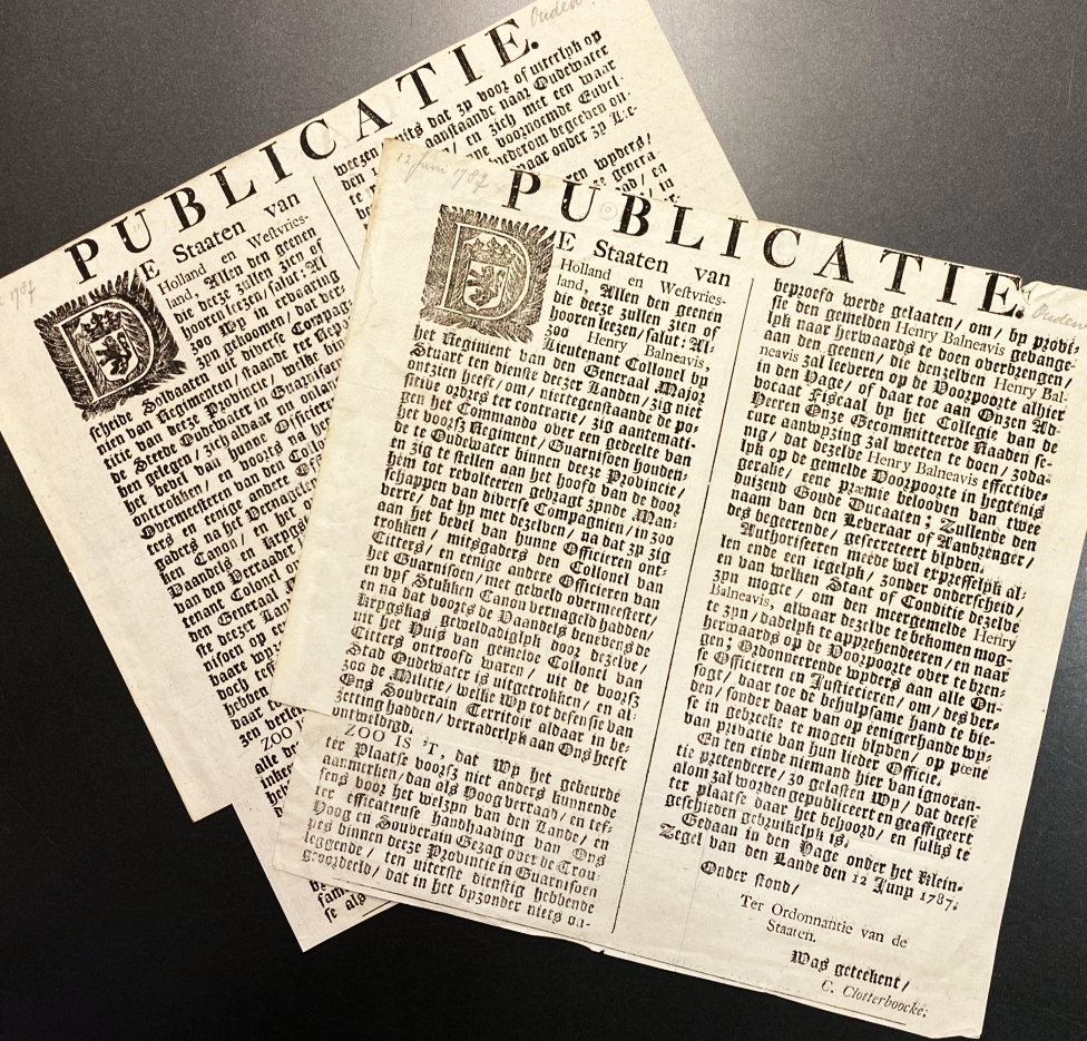 * Over het hoogverraad van de officier Henry Balneavis, die met een aantal soldaten zijn kolonel Van Citters van het garnizoen van Oudewater had overmeesterd, vijf kanonnen had vernageld, de krijgskas en de vaandels had gestolen uit het huis van Van Citters, en was weggetrokken uit zijn garnizoensstad. Het eerste plakkaat looft een beloning van 2000 gouden dukaten uit voor wie de gouden tip geeft om Balneavis te vangen neemt ‘zullende den naam van den Leveraar of Aanbrenger des begeerende gesecreteert blijven’. Het tweede plakkaat belooft amnestie aan de soldaten die zich vóór 1 juli overgeven ‘met een waar berouw over hunne voornoemde Euveldaaden en desertie’, zij zullen weer in hun compagnieën mogen dienen. Ondertekend door C. Clotterboocke.
