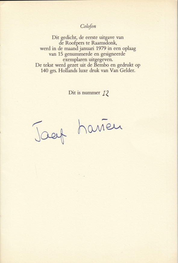 * Exemplaar met handgeschreven opdracht van de auteur op de opdrachtpagina: ‘Er zijn twee soorten van/ mensen; de ene soort/ bestaat niet./ Voor vriend Ronald [Breugelmans],/ met hartelijke groet,/ Jaap/ 9-2-79’. Eerste uitgave van de Roofpers te Raamsdonk.