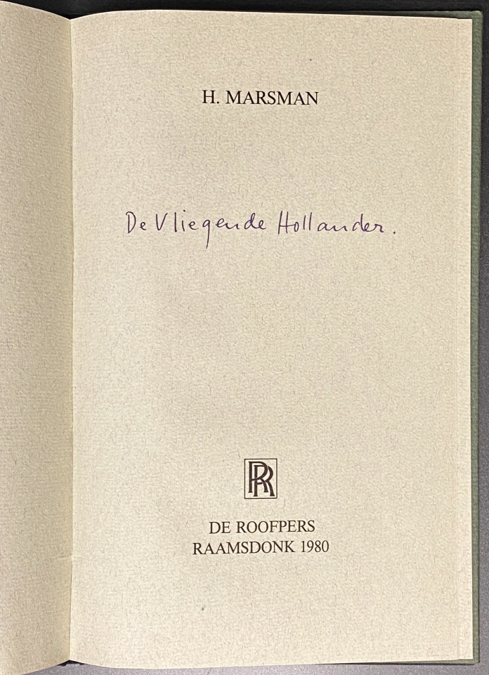 11. MARSMAN, H. De vliegende Hollander. Raamsdonk, De Roofpers, 1980. Linnen met stofomslag. (24) p. Gedrukt in paars en zwart in een oplage van 50 genummerde exemplaren. Mooi.
