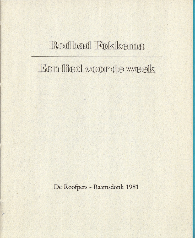 7. FOKKEMA, Redbad Een lied voor de week. Raamsdonk, De Roofpers, 1981. Ingenaaid met stofomslag. (16) p. Gedrukt in een oplage van 25 genummerde en gesigneerde exemplaren. 1e druk. Schaafplekjes op achterzijde omslag.