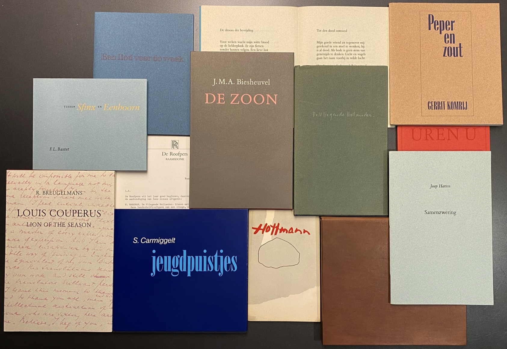 Over De Roofpers uit Raamsdonk is niet veel informatie te vinden. De naam heeft niets met roofdrukken te maken, het zijn allemaal keurige, geautoriseerde uitgaven van respectabele auteurs van Biesheuvel tot Komrij, verschenen in oplagen variërend van 15 tot 75 exemplaren, altijd genummerd en meestal gesigneerd door de auteur. Het vignet van de pers is wél geroofd: er is leentjebuur gepleegd bij Rolls Royce!