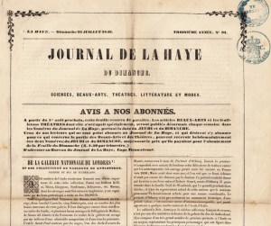 * Speciaal zondagsblad van de Journal de La Haye (1830-1849), gewijd aan kunsten en wetenschappen. Geheel Franstalig Nederlands weekblad met veel internationaal kunstnieuws. Het aardigste is een blik op de toekomst in het laatste nummer: ‘Un journal en l’an 3246’, waarin een ondergrondse trein van Londen naar Edinburgh verongelukt, een treinreis van Parijs naar Kanton twee dagen duurt, iemand een 300-delige roman publiceert die te koop is voor 300.000 francs per deel, en een reusachtig monument wordt opgericht voor Alexandre Dumas.