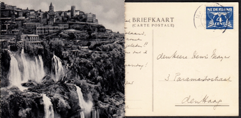 33. STOLS, A.A.M. Handgeschreven ansichtkaart aan ‘Den Heere Henri Mayer’. Gesigneerd en gedateerd ‘Maastricht/ 16/6’ [1948?]. 8 regels tekst.