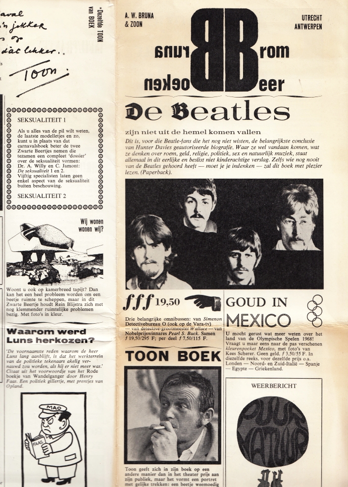 * Reclamekrant voor uitgeverij Bruna, wat een prachtig tijdsbeeld! Van Toon Hermans tot Topor, met Maigret, De Schaduw, Rosemary’s Baby, de Naakte Aap, de Forsyte Saga, Dick Bruna, Zwarte Beertjes en om te beginnen: De Beatles!