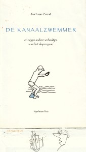 45. ZOEST, Aart van De kanaalzwemmer. En negen andere verhaaltjes voor het slapen gaan. Leerdam, Nymphaeum Pers, 2003. Gevouwen in omslag. 32 p. Met tekeningen. Gedrukt in 100 genummerde exemplaren. 1e druk. Met inliggende uitnodiging voor de presentatie (4 p., met tekening). Spatjes op omslag.