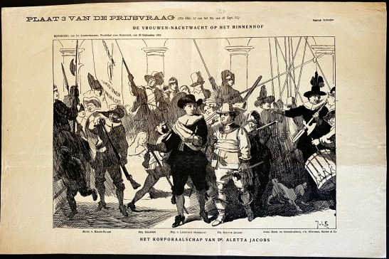 * Tekening naar De Nachtwacht van Rembrandt, waarbij de gezichten van de centrale figuren vervangen zijn door die van de feministes Mevr. Van Balen-Klaar, Mej. Kramers, Mej. Van Lanschot Hubrecht en Dr. Aletta Jacobs. Op de achtergrond zijn nog verschillende andere wellicht bekende voorvrouwen te bespeuren, die het geweer hanteren, een hellebaard zwaaien of de trommele roeren.