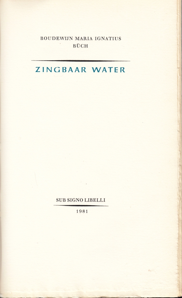 7. BÜCH, Boudewijn Zingbaar water. [Amsterdam], Sub Signo Libelli, 1981. Linnen met lederen rugschildje. (32) p. Met de hand gezet en gedrukt met de Walbaum in blauw en zwart in een oplage van 75 genummerde exemplaren. 1e druk.