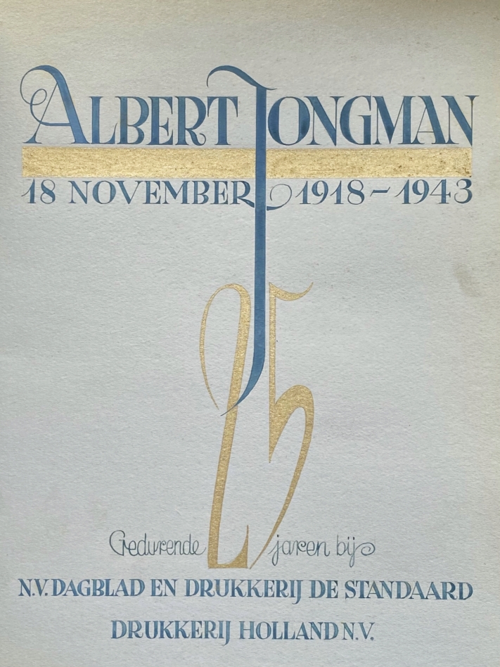 * Verbluffend knap getekend gedenkboek voor Albert Jongman (1892-1973), directeur van Drukkerij Holland N.V. aan de Nieuwezijds Voorburgwal 58-60 te Amsterdam. Het tekenwerk werd verzorgd door W. den Uyl en de redactie was van W. Verheggen. Bindwerk G.W.C. Paardekooper. Inliggend twee handgetekende dankkaartjes en een gekalligrafeerd vouwblad, met collages in zilver, waarop (kennelijk) de namen van alle medewerkers van de drukkerij staan. Albert Jongman was (vanaf 1964) de schoonvader van Huib van Krimpen. N.B. Dit boek is niet gedrukt, er is er maar één van.