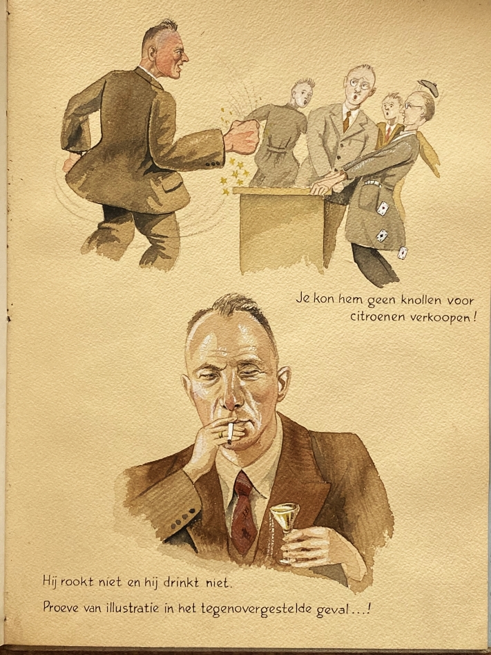 27. UYL, W. den Albert Jongman 18 November 1918-1943. (Gedenkboek ter herinnering aan de 25 jaren waarin Albert Jongman verbonden was aan N.V. Dagblad en Drukkerij De Standaard / Drukkerij Holland N.V. [te Amsterdam].) Linnen met opdruk in zilver. 7 bladen. Zilverkleurige schutbladen. Eerste blad: portret van Jongman in kleuren, gesigneerd ‘Den Uyl’. Tweede blad: titelpagina gecalligrafeerd in blauw en zilver. 3-6 bladen getint tekenpapier, aan beide kanten voorzien van tekeningen met gouache – Jongmans levensloop. Zevende blad: tweezijdig getekend in blauw op lichtblauw, met teksten in zwart en met ingeplakte familiefoto. Laatste schutblad in goud en zwart versierd, met colofon op etiket.