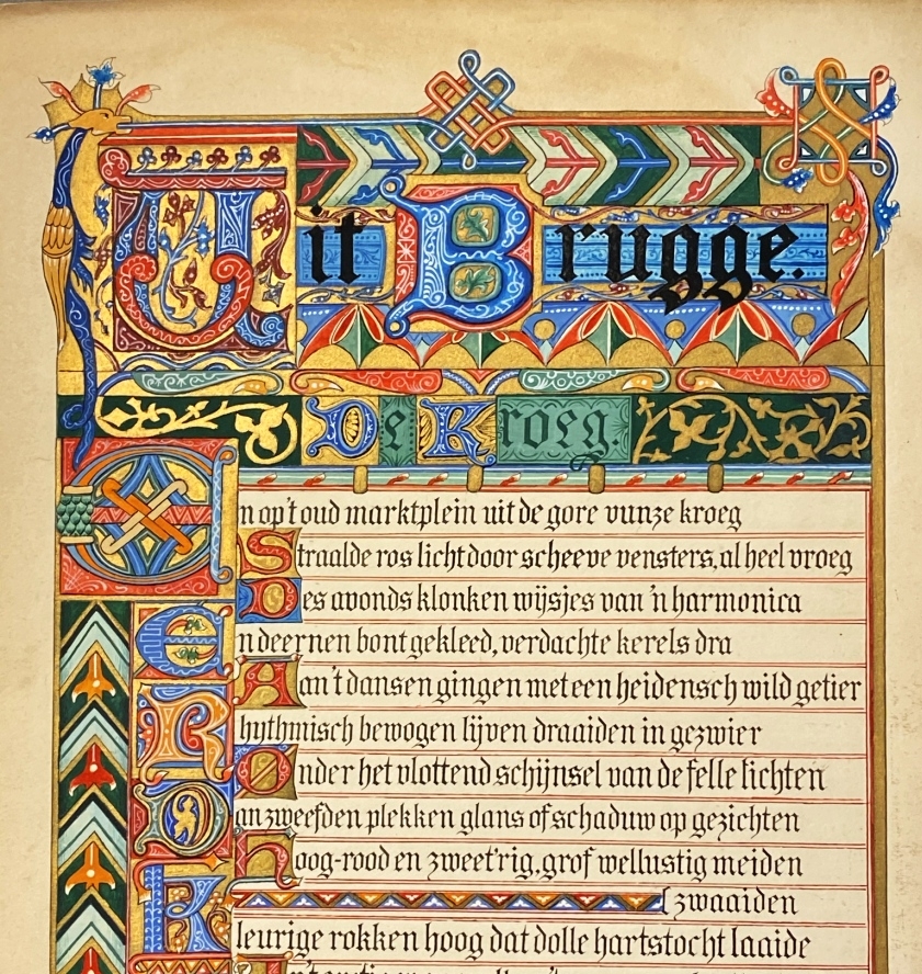 18. KALLIGRAFIE De kroeg. (Uit Brugge). Handgetekende kalligrafie van Johan Bautz (1840-1912), waarschijnlijk ca. 1910. Gevouwen blad, 42 x 28 cm. Geschreven op de eerste en derde bladzijde, de andere twee blanco. Met goud en vele kleuren op gotische wijze schoongeschreven gedicht van Jules Schürmann. Aan de randen wat stoffig en verbruind, maar de kalligrafie zelf is gaaf bewaard gebleven, de felle kleuren en het doffe goud zijn niet verkleurd.