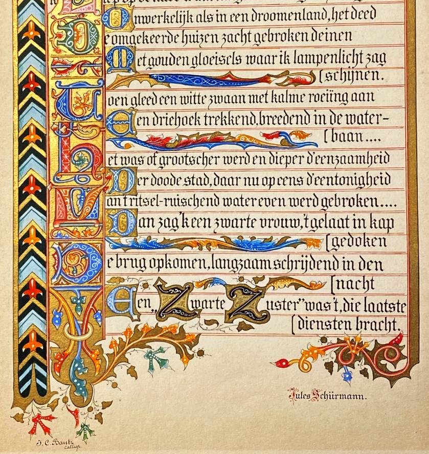 * De kunstzinnig aangelegde ambtenaar Johan Bautz, commies bij het Nederlandse Ministerie van Oorlog, was de vader van de schilder David Bautz, die bevriend was met de Rotterdamse dichter Jules Schürmann (en met Jan Greshoff). Curieus, dit expressief gedicht met zijn orgiastische woestheid, in schijnbare tegenspraak met de gouden initialen, fabeldieren en tierelantijnen. Opmerkelijk ook de twee Zwarte Z’en in de tekst aan het eind: ‘Een Zwarte Zuster was ‘t, die laatste diensten bracht’. Twee bladen schrijfkunst waaraan heel wat te beleven valt.
