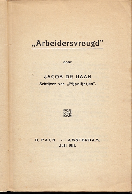16. HAAN, Jacob Israël de Arbeidersvreugd. Amsterdam, D. Pach, 1911. Ingenaaid. (2), 72 p. Niet afgesneden. 1e druk. Omslag wat verkleurd en gekreukt, met enkele reparaties (door Louis Putman). Binnenin enige roest, maar de staat van dit uiterst kwetsbare boek is zonder meer goed.