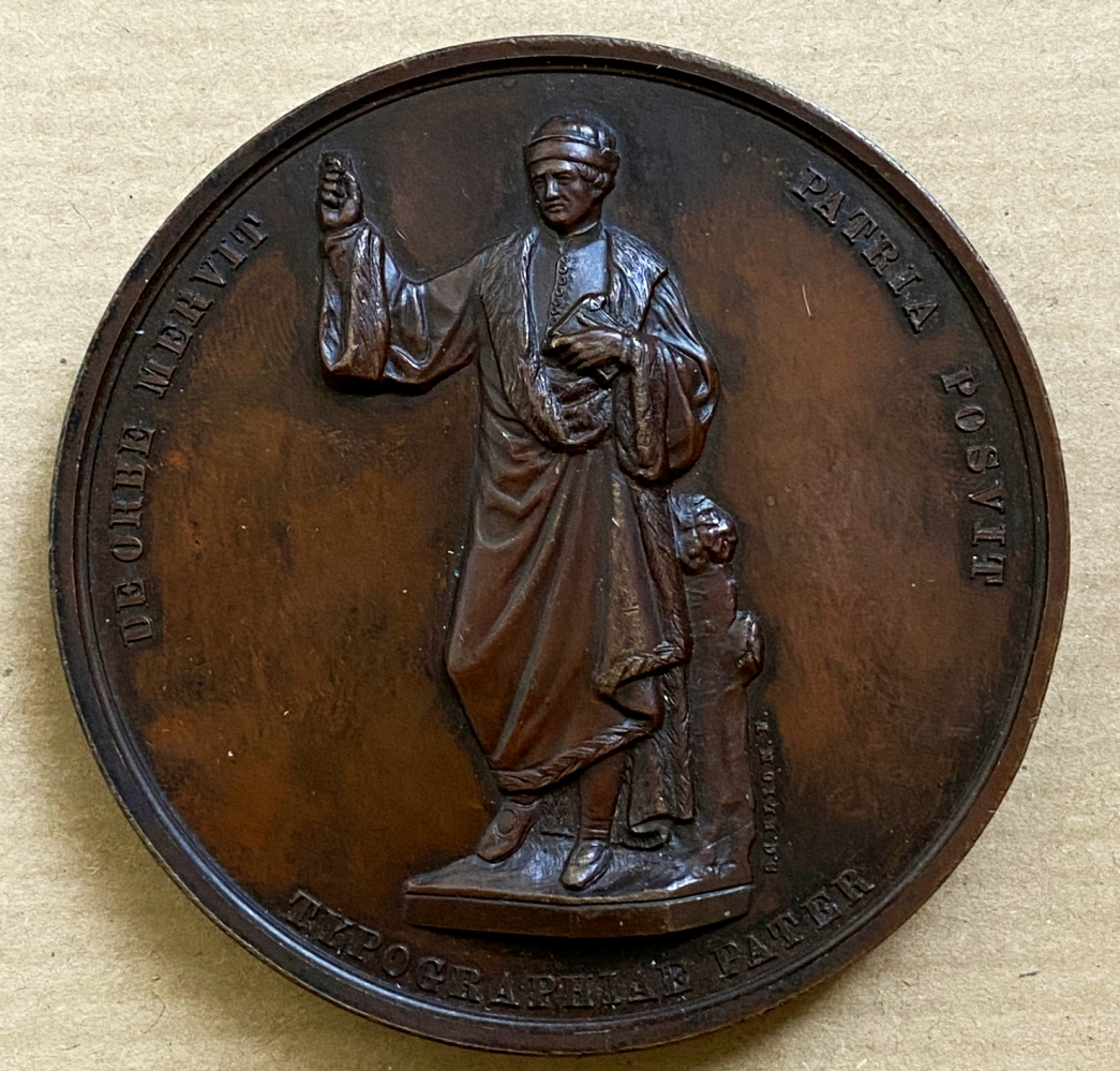 * In 1856 werd de oprichting van het standbeeld van de Nederlandse ‘uitvinder van de boekdrukkunst’ met grote volksfeesten gevierd. Forse feestpenning, gesneden door Samuel Cohen Elion (1812-1880), die op last van koning Willem III werd uitgereikt aan de leden van de oprichtingscomités van dit standbeeld. De Latijnse tekst is gelijk aan die van het beeld. (Beide kanten hebben dezelfde chocoladebruine kleur, maar bij de rechterfoto is ander licht gebruikt).