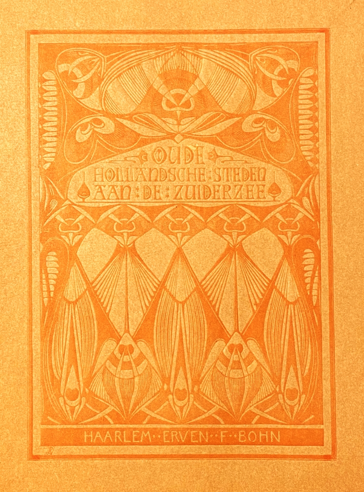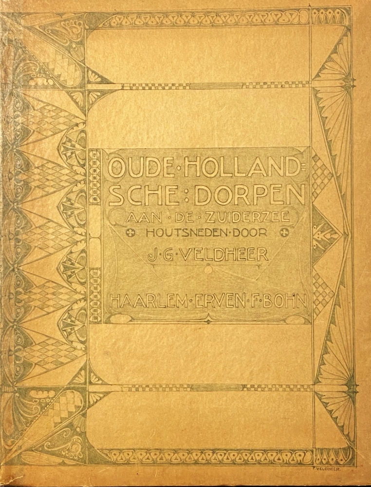 29. VELDHEER, J.G. Oude Hollandsche dorpen aan de Zuiderzee, door J.G. Veldheer. Haarlem, Erven F. Bohn, 1900. 34 x 27 cm. Halflinnen band overtrokken met gedecoreerd perkaline. (8), 52 p. Titel in rood en zwart. Met 12 originele houtsneden (10 topographische gezichten, een frontispice met koggeschip; en een pagina in jugendstil-kader) van J.G. Veldheer, met initialen in rood. Tekst van Veldheer met W.J. Tuyn. 1e druk. Kwetsbaar omslag heeft enkele gaatjes in de rug, krasjes, achterop bruine vlekjes. Achterin is een merkje ingeplakt van boekhandel J.H. de Bois in Haarlem (ca. 1920).