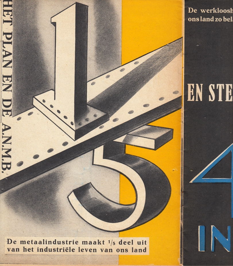 25. SCHWARZ, S.L. Het plan en de A.N.M.B. Uitgave van de Algemene Nederlandse Metaalbewerkersbond samengesteld in overleg met de Centrale Plan-Commissie. Zonder plaats, Algemene Nederlandse Metaalbewerkersbond, [1936]. Geniet. (16) p. Geheel getekend en gedrukt in kleuren naar ontwerp van S.L. Schwarz. Achteraan een uitklapblad met aanmeldbon. 1e druk. Wat slijtage, hakjes en speldenprikken.