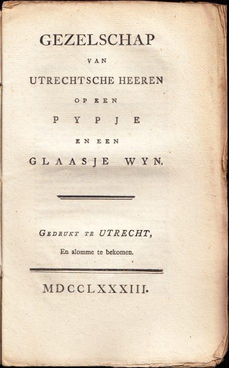 26. UTRECHT Gezelschap van Utrechtsche Heeren op een pypje en een glaasje wyn. Utrecht, anoniem uitgegeven, 1783. Cahiersteek. (2), 18 p. Gedrukt op goed papier. Niet afgesneden. Nummertje voorop. In goede staat.