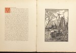 28. VELDHEER, J.G. Oude Hollandsche steden aan de Zuiderzee door W.O.J. Nieuwenkamp en J.G. Veldheer. Haarlem, Erven F. Bohn, 1897. 34 x 27 cm. Ingenaaid. (8), 52 p. Met 20 reproducties van tekeningen naar Nieuwenkamp (en een aantal initalen) d.m.v. zincografie, en een frontispice met koggeschip, een pagina in jugendstil-kader en initialen in houtsnede uitgevoerd door Veldheer, alles in zwart gedrukt. Tekst van Veldheer met W.J. Tuyn. 1e druk. Rug en randen verbruind en niet helemaal gaaf. Boekblok los van omslag. Binnenin wat roest.