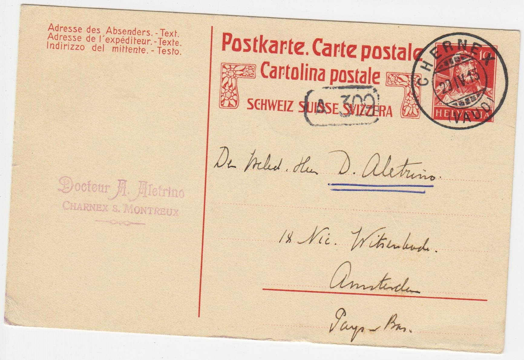 1. ALETRINO, Arnold Handgeschreven briefkaart aan zijn broer David: ‘Den Weled. Heer D. Aletrino’. Lichtgele officiële Zwitserse briefkaart met in rood voorgedrukte zegel van 10 rappen. 8,9 x 14,0 cm. Recto en verso. Gesigneerd ‘Arnold’ en gedateerd ‘Chernex s. Montreux Chalet George Maurice. ’30 April ’15’. 8 regels tekst. Laatste drie zinnen onderstreept.