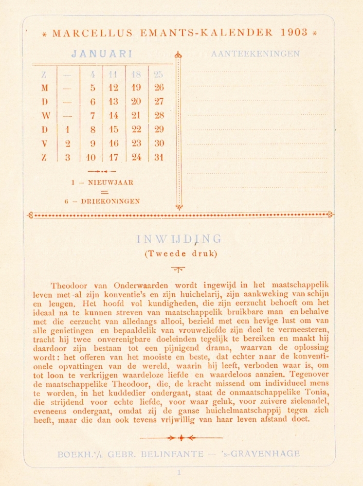 20. (EMANTS, Marcellus) Marcellus Emants-kalender 1903. Amsterdam/ Den Haag, Van der Land/ Belinfante, [1903]. Geniet. (24) p. Gedrukt in oranjebruin en bleekblauw. Met achterin een bestelkaart. 1e druk.