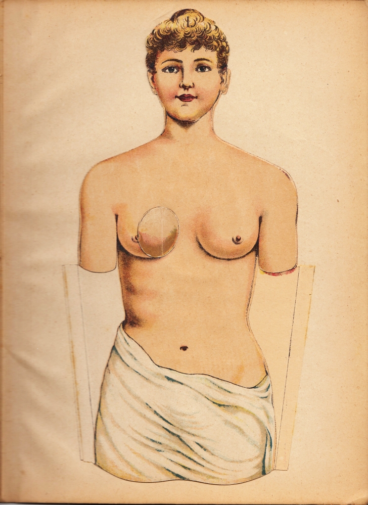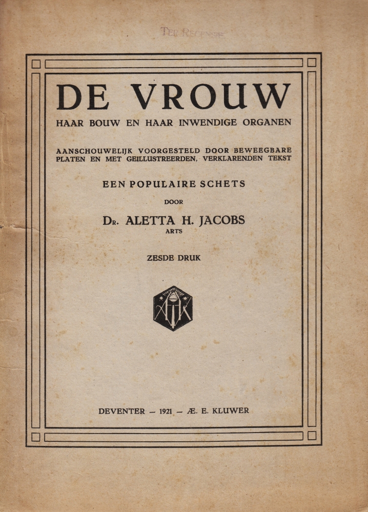 33. JACOBS, Aletta De vrouw. Haar bouw en haar inwendige organen. Aanschouwelijk voorgesteld door beweegbare platen en met geïllustreerden, verklarenden tekst. Een populaire schets. Deventer, AE.E. Kluwer, 1921. 27 x 21 cm. Kartonnen platten met linnen rugje. 48 p. Illustraties. Achterin een beweegbaar model van het vrouwenlichaam: ingewanden, skelet. 6e druk. Stempeltje ‘Ter bespreking’ en handtekening van recensent Martinus Werkman. In goede staat; in het beweegbaar model zit één klein onderdeel los.