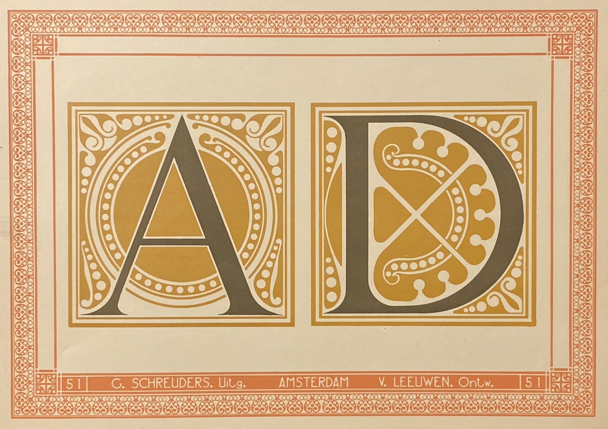 * Schitterende lettervoorbeelden en alfabetten, virtuoos getekend door de kunstenaar Klaas van Leeuwen (1867-1935) naar voorbeelden uit heden en verleden. Onder meer met letters naar Dürer en Tory, maar ook naar Van Leeuwens moderne geestverwanten K.P.C. de Bazel en M. Lauweriks. Mooi aan de muur.