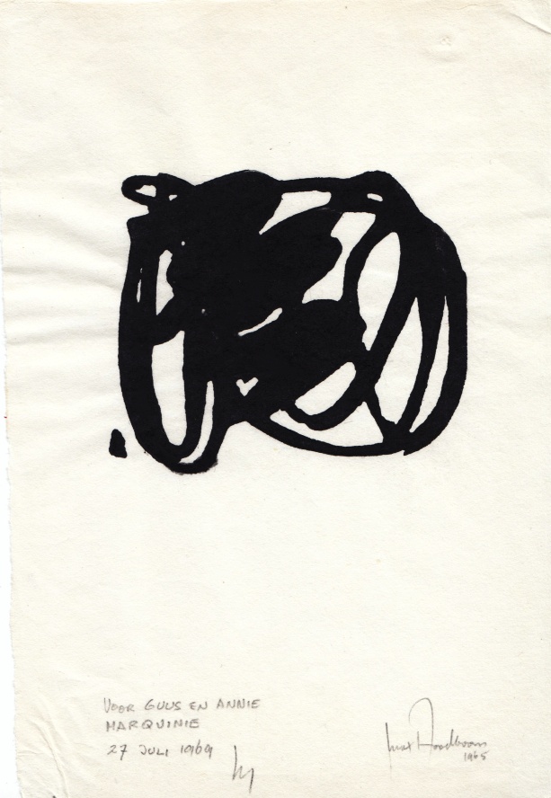 4. APPELBOOM, Max Originele lithografie, met getypte brief. Lithografie afgedrukt op Japans papier (23,0 x 16,3 cm), in potlood gesigneerd met het jaar 1965. Voorzien van een handgeschreven, geparafeerde opdracht in potlood ‘Voor Guus en Annie/ Marquinie/ 27 juli 1969’. Met een getypte brief (26 regels) op papier met gedrukt adres in Antwerpen, eveneens gedateerd 27 juli 1969 en in dikke blauwe inkt gesigneerd.