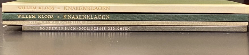 44. (SUB SIGNO LIBELLI). KLOOS, Willem Knabenklagen. (Met een verantwoording door Harry G.M. Prick). [Amsterdam], Sub Signo Libelli, 1981. Linnen (Binderij Phoenix). 32 p. Met de hand gezet uit de Spectrum en gedrukt in groen en zwart door Ger Kleis in een oplage van 75 genummerde exemplaren. 1e druk.