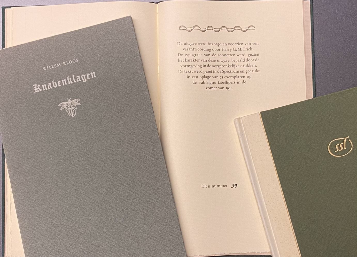 43. (SUB SIGNO LIBELLI). KLOOS, Willem Knabenklagen. (Met een verantwoording door Harry G.M. Prick). Sub Signo Libelli, 1981. Ingenaaid met omslag. 32 p. Met de hand gezet uit de Spectrum en gedrukt in groen en zwart in een oplage van 75 genummerde exemplaren. 1e druk. Exlibris van F.L. Bastet op voorste schutblad.