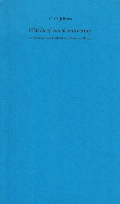 13. JELLEMA, C.O. Wat bleef van de ontroering. Brieven uit Griekenland aan Marjo en Theo. (Met een houtgravure van Peter Lazarov). Woubrugge, Avalon Pers, 2007. Ingenaaid. 36 p. Gezet uit de Bembo en gedrukt in een oplage van 99 genummerde exemplaren. 1e druk.