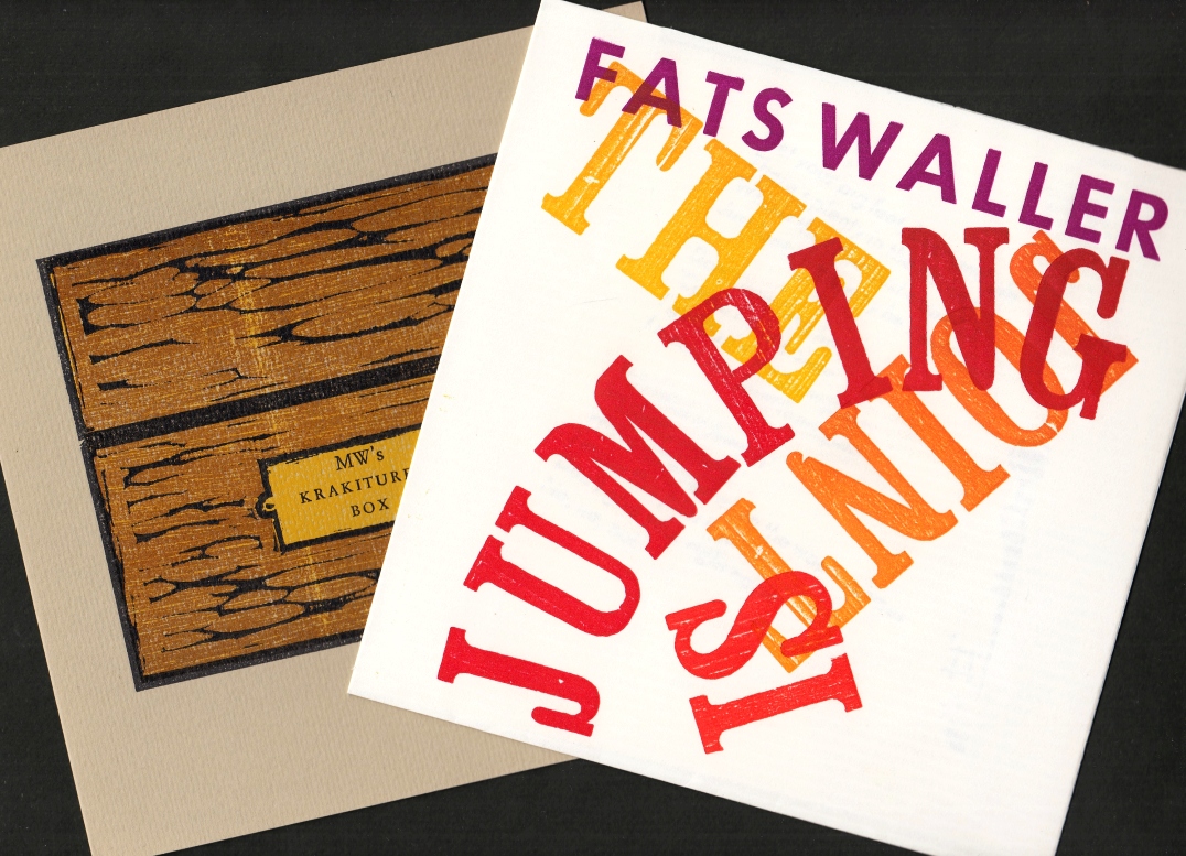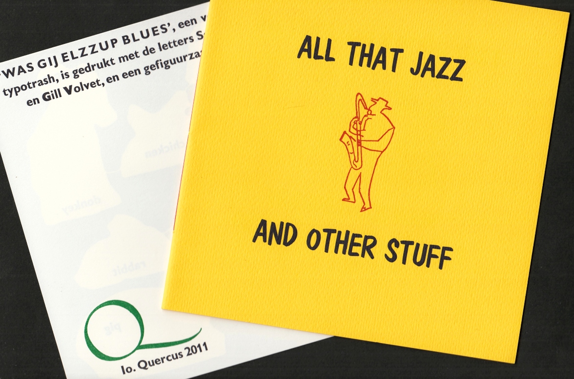 9. (DRUKWERK IN DE MARGE) All that jazz and other stuff. Vriendendoos voor Dick – Het Gonst – Wessels. Drukwerk in de Marge, 2011. 31 bibliofiele uitgaven van 18 x 18 cm in ouderwets platenkoffertje voor singels. Vervaardigd in een oplage van 40 exemplaren.