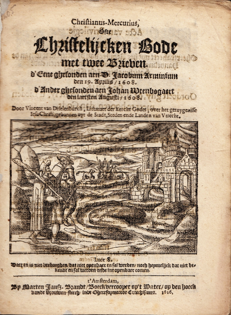 8. DRIELENBURCH, Vincent van Christianus-Mercurius, ofte Christelijcken bode met twee brieven. d’eene ghesonden aen D. Iacobum Arminium den 19. aprilis, 1608. d’ander ghesonden aen Iohan Wtenbogaert den laetsten augusti, 1608. Amsterdam, Marten Jansz. Brandt, 1616. Vroeg 20e-eeuws omslagje. 32 p. Met grote emblematische titelprent, iets kleinere slotprent (uitgeversmerk), sierlijsten en initiaal. 1e druk. Het pamflet zelf in goede staat. Het omslag (niet het oude pamflet) met stempels van de R.K. Leergangen en achterin een scheur.