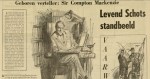 * Met handgeschreven opdracht van Compton Mackenzie aan Anthony van Kampen, gedateerd ‘Edinburgh/ March 26. ’63’. Met een getypt menu ‘Dejeuner’ van het Caledonian Hotel in Edinburgh van dezelfde datum (hoofdgerecht: Filet de Sole Mornay). Reisschrijver en journalist Anthony van Kampen bezocht Mackenzie, vergezeld door zijn tekenaar Reint de Jonge, als onderdeel van een serie reportages in Schotland. Zijn geïllustreerde artikel verscheen onder meer in de Leeuwarder Courant van 20 juli 1963 (rubriek ‘Sneon en snein’), maar ook in het Leidsch Dagblad van 7 januari 1964 en wellicht ook elders. Dit door Mackenzie geschonken boek wordt er genoemd (zie in het kadertje links op het knipselplaatje, dat is overgenomen uit Delpher) evenals de ontvangst in het Caledonian Hotel.