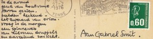 25. OOSTERHUIS, Huub Handgeschreven gedicht op een ansichtkaart, gericht aan Gabriël Smit. Gesigneerd ‘Huub’ en gedateerd (datum poststempel) 27-2-1976.