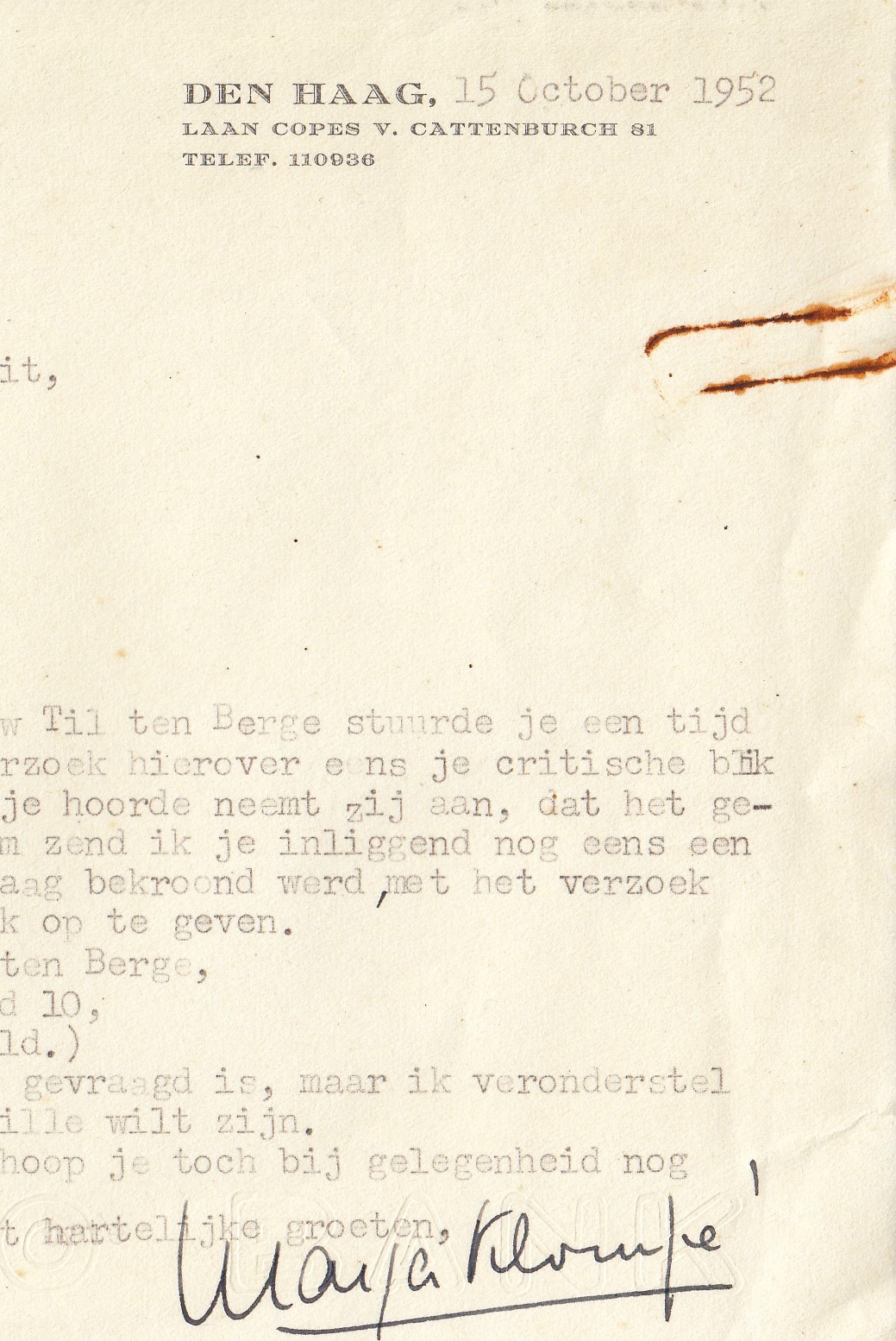 15. KLOMPÉ, Marga Getypte brief aan ‘Beste Gab’ (= Gabriël Smit). 13,8 x 21,7 cm. Oblong. Gesigneerd ‘Marga Klompé’ en gedateerd ‘Den Haag, 15 October 1952’. Op eigen briefpapier. 11 regels tekst.