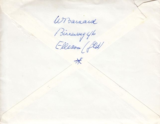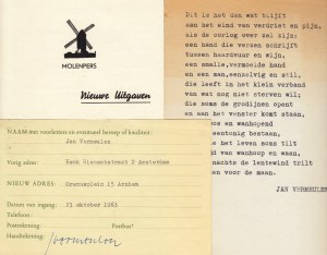 * In een door Vermeulens vriend Gerrit Achterberg aan Kees Lekkerkerker geadresseerde envelop (waarop geplakt de bekende postzegel met driekruinenboom), met achterop het adresstempel van Jan Vermeulen in Leiden. Zeer zeldzaam, in 1975 volgens de concordantie van Simoni niet in de UBL, UvA, KB, RIOD of British Museum. Inmiddels wel in de KB. De Jong 899.