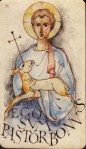 7. COLLETTE, Joan Handgeschilderd bidprentje op perkament. 9,4 x 5,5 cm. Met op de voorzijde een tekening van Christus als herder met lam in inkt en aquarel en de tekst ‘Ego sum pastor bonus’, gesigneerd ‘Joan C’. Op de achterzijde een tekst uit Johannes en de toevoeging ‘Bidden we voor elkaar. Joan Collette, mei 1943’.