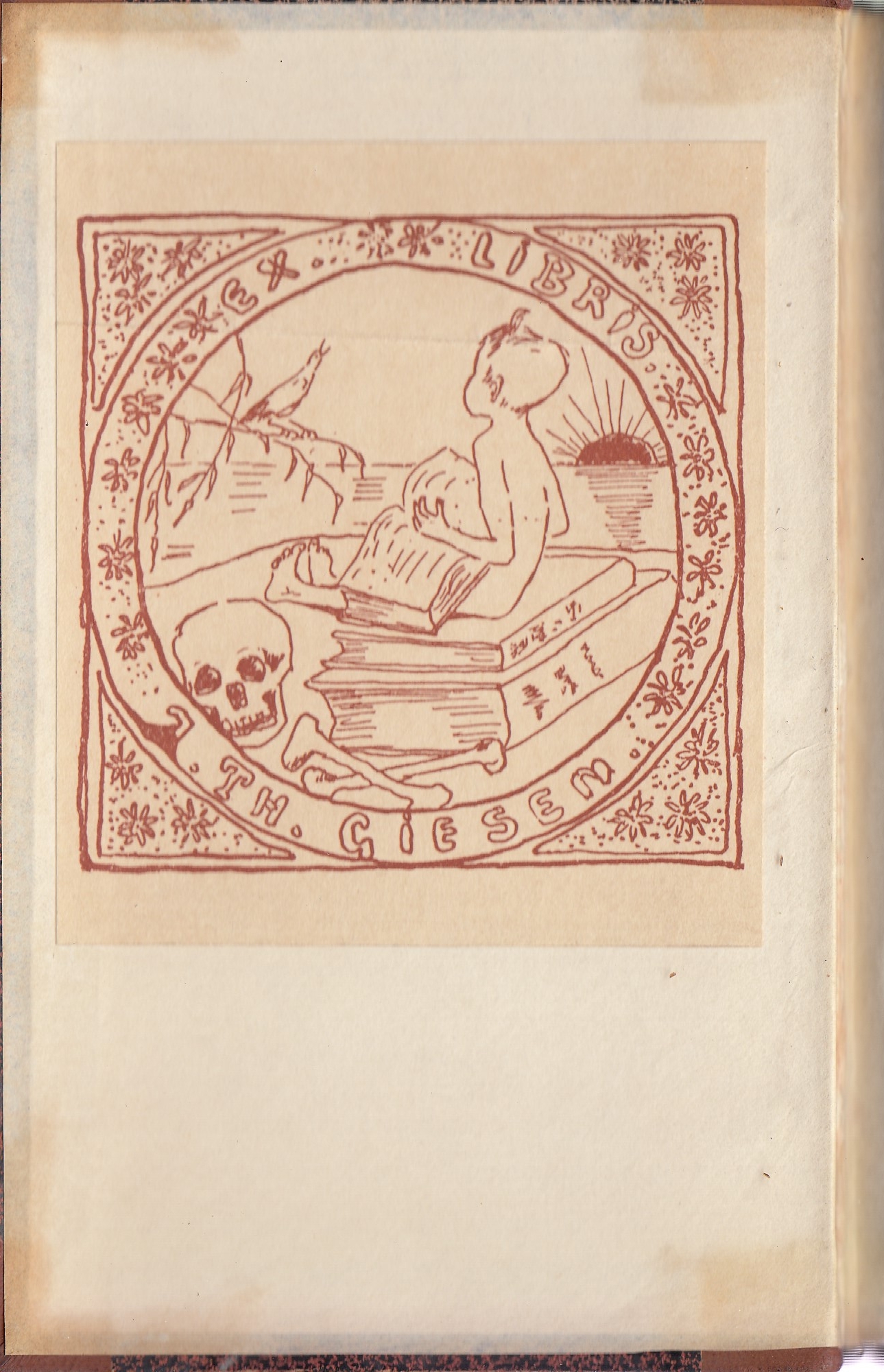 28. REKENBOEKJE Koopmans en winkeliers hand-boekje, waar in men met een opslag kan zien als men weet tot wat Prys ’t stuk, de el, het pond of wat het ook zyn mag, gekogt is, hoe veel de somma van de geheele koop bedraagt. Zeer dienstig voor alle kooplieden, suyker-handelaars, winkeliers, cassiers, maakelaars, voor werk-baazen om hunne knegts de dagloonen te betaalen, en voor schoolmeesters om hunne leerlingen sommen op te geven. Benevens, een uitrekening van intresten of kortinge der Pr. centen (…). Amsterdam, Jacobus Haffman, [1744]. Mooie boekband uit de eerste helft van de 20ste eeuw met vergulde geitenleren rug, titelschildje en gemarmerde platten. (8), 182 p. (van de 324 p.). Met handgeschreven signatuur van Jacobus Haffman aan het eind van het voorwoord: ‘De drukker aan den gebruyker’. 1e druk. Vooral eerste bladen nogal vuil en versleten. Met mooi exlibris van de kunstenaar Jan Theodoor Giesen (1900-1982): een kind op een stapel boeken kijkt naar een zingende vogel, met een doodshoofd aan zijn voeten.