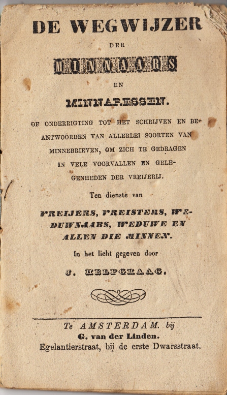 17. HELPGRAAG, J. De wegwijzer der minnaars en minnaressen. Of onderrigting tot het schrijven en beantwoorden van allerlei soorten van minnebrieven, om zich te gedragen in vele voorvallen en gelegenheden der vreijerij. Ten dienste van vreijers, vreisters, weduwnaars, weduwe en allen die minnen. Amsterdam, G. van der Linden, (ca. 1870). Ingenaaid. 48 p. Herdruk van een rond 1800 voor het eerst gedrukt werkje. Dit boek heeft veel geleden: aan randknabbeling, bevlekking, ezelsoortjes en waarschijnlijk aan enthousiast gebruik, alles ter meerdere Eer en Glorie van de Liefde.