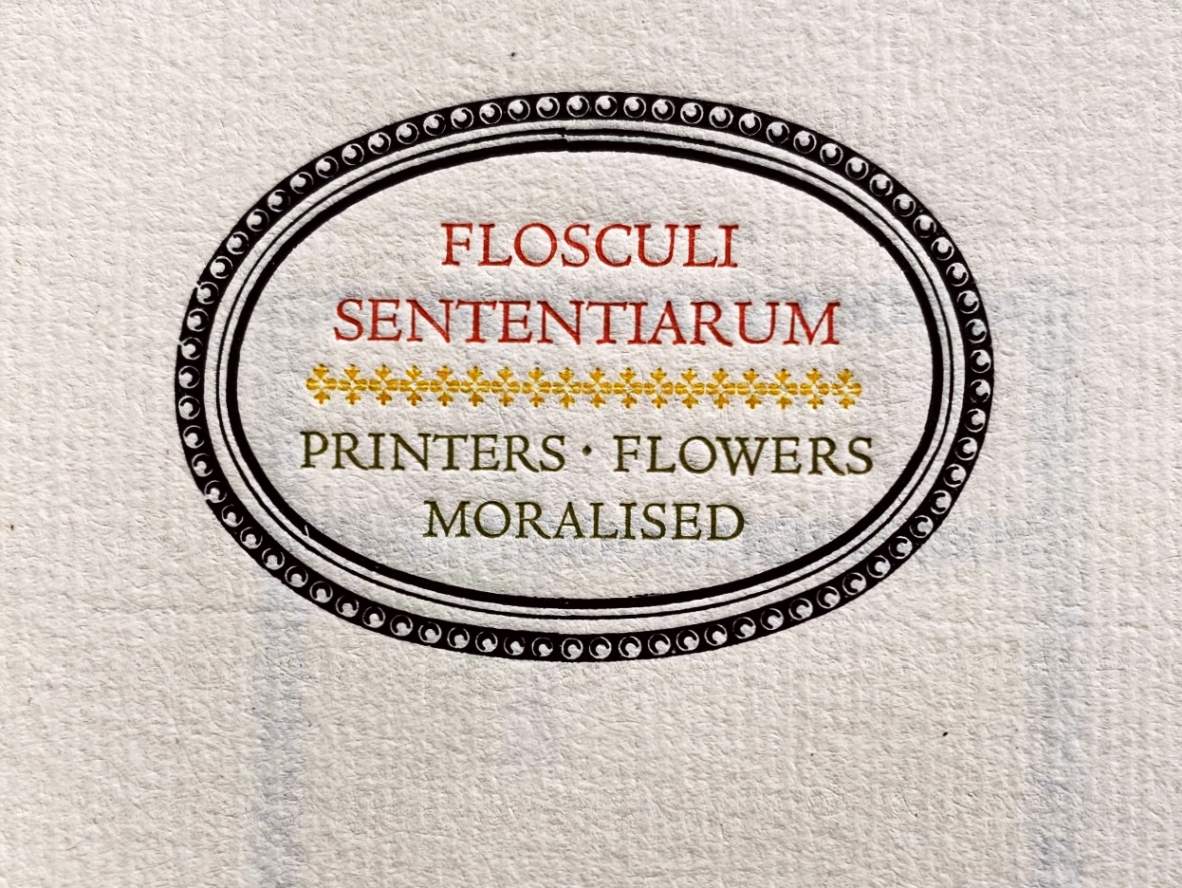 Een groot genot voor de typografieminnaar! Achterin een fantastisch gestyleerde, feestelijke toelichting van de boekgeleerde Dale R. Roylance. Dit uiterst begerenswaardige boek komt uit de collectie van Huib van Krimpen. De titel ‘Flosculi Sententiarum’ betekent letterlijk ‘bloemetjes van de zinspreuken’ of van de wijsheid. En kleurige, geestrijke bloemen, dat zijn het.