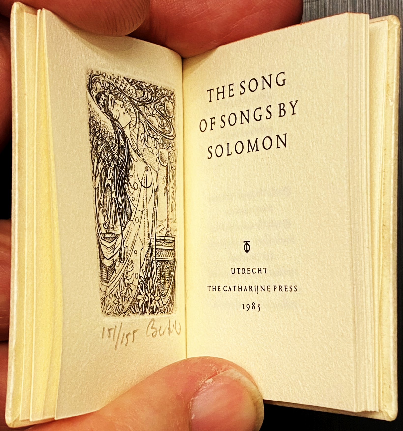 18. HOOGLIED The Song of Songs. (Met een genummerde en gesigneerde kopergravure van Bertil Schmüll). Utrecht, The Catharijne Press, 1985. 6,2 x 4,3 cm. Verguld heelperkament (Luce Thürkôw). 54 p. Gezet uit de 5-punts Trinité Medium Italic 4 en gedrukt op Simili Japon in een oplage van 155 genummerde exemplaren. Typografie Bram de Does. 1e druk.