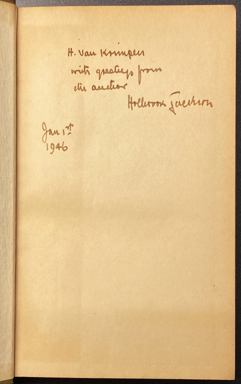 * Met handgeschreven, gesigneerde opdracht van Jackson: ‘ H. van Krimpen/ with greetings from/ the author/ Holbrook Jackson/Jan 1st/ 1946’. Zie over dit boek p. 26 in De couturedoos.