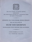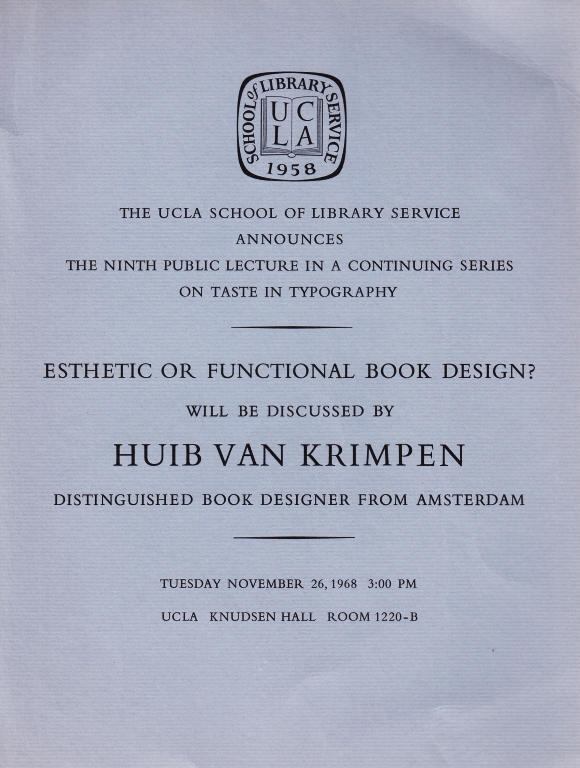 26. KRIMPEN, Huib van Esthetic or Functional Book Design? Poster voor een lezing van Huib van Krimpen (‘Distinguished Book Designer from Amsterdam’) aan de UCLA School of Library Service, 26 november 1968. 27 x 21 cm.