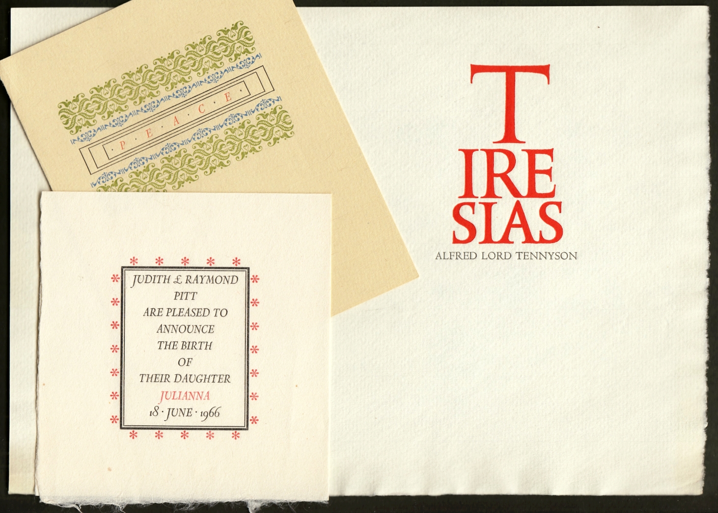 10. (GEHENNA PRESS). BASKIN, Leonard Drie familie-aankondigingen, drie proefdrukken en een prospectus. Huwelijksaankondiging van Baskin zelf, geboortekaartje van Judith & Raymond Pitt, nieuwjaarswens voor 1968; 8 van de 16 pagina’s van Alcuins Scholastic Dialogue (1968), een proef van de titelpagina van Tennysons Tiresias (1970) en een fragment van 8 p. uit An Essay of Typography van Eric Gill, ontworpen en gezet door Leonard Baskin en gedrukt in kleuren met de fijnzinnige sierranden en -blokjes waar Baskin een meester in was – op diverse soorten geschept papier. Met een prospectus voor Baskins boek Caprices & Grotesques plus een naamblaadje. Jaren 60. Formaten tot 27 cm.