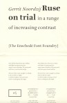 * Weer zo’n huzarenstukje van Gerrit Noordzij: de letter Ruse, die hij baseerde op zijn handschrift, wordt met al zijn tekens in romein en cursief getoond in maar liefst elf verschillende diktes! ‘Printed for the fun of the designer and his printer, Casparie, Heerhugowaard’. Ook bedoeld voor uitgeverij Van Oorschot, die de verzenbundel van Housman in 1993 uitgaf als Een jongen van het land, en voor lettergieterij Enschedé zodat het lettertype bekritiseerd kan worden.