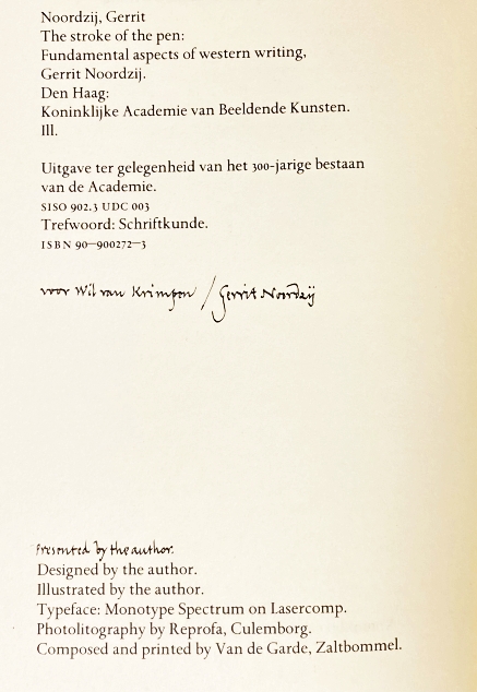 * Met inliggende aanbiedingskaart gesigneerd door twee directeuren, waarvan alleen de naam A.W. van der Heiden leesbaar is. Er was ook een handelsuitgave met een oplage van 1000 exemplaren. Dit boek is een verdere ontwikkeling van Noordzijs eerdere Engelstalige boek The stroke of the pen.