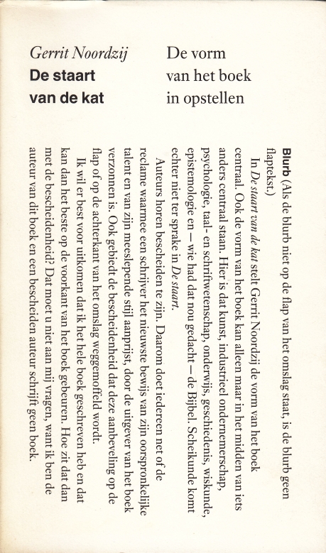 41. NOORDZIJ, Gerrit De staart van de kat. De vorm van het boek. Leersum, GHM, 1988. Ingenaaid met stofomslag. 112 p. Met illustraties (penvoeringen). 1e druk. Lichte gebruikssporen.