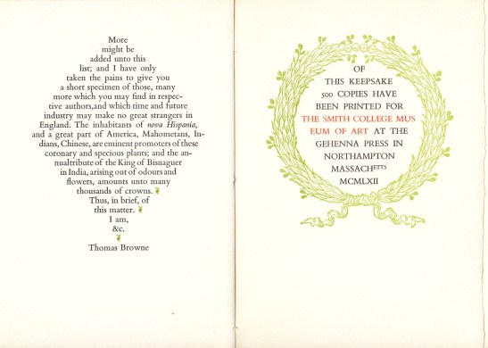 8. (GEHENNA PRESS). BROWNE, Thomas Of Garlands and Coronary or Garland Plants. Thomas Browne to John Evelyn Esq. F.R.S. Northampton, MA, Gedrukt door de Gehenna Press voor The Smith College Museum of Art, 1962. Cahiersteek. Gedrukt in rood, groen en zwart in 750 exemplaren op geschept papier. Fraai exemplaar.