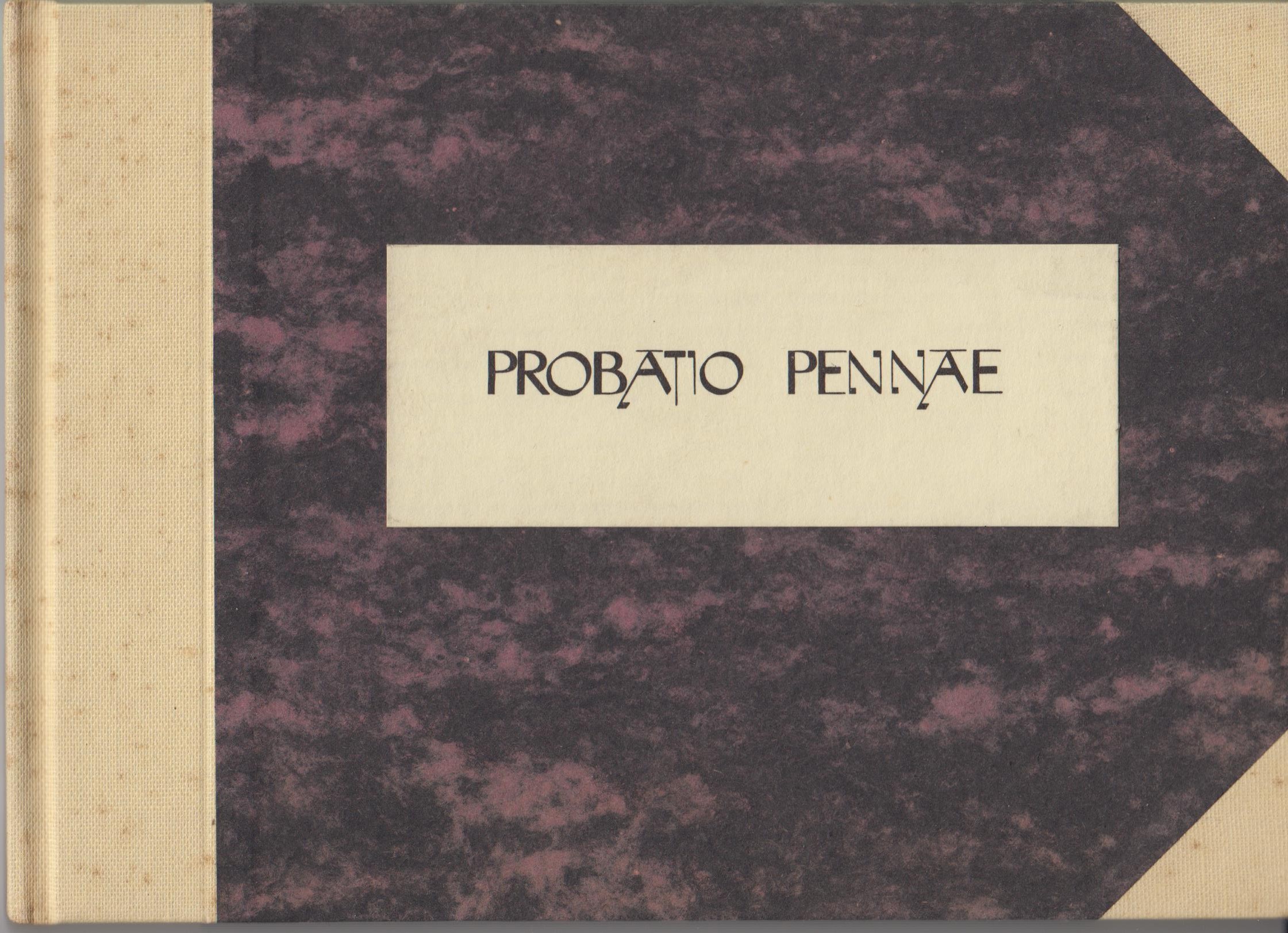 57. VERHOEVEN, Cornelis, & Evert van DIJK Probatio pennae. Ulvenhout, Pen en Burijn, (1980). Haneboeken 5. Oblong 13 x 18 cm. Halflinnen met hoeken. (4), 28 p. Gedrukt (naar calligrafie van Evert van Dijk) door Anne Oudega te Woudrichem in 200 genummerde exemplaren, gesigneerd door beide schrijvers.