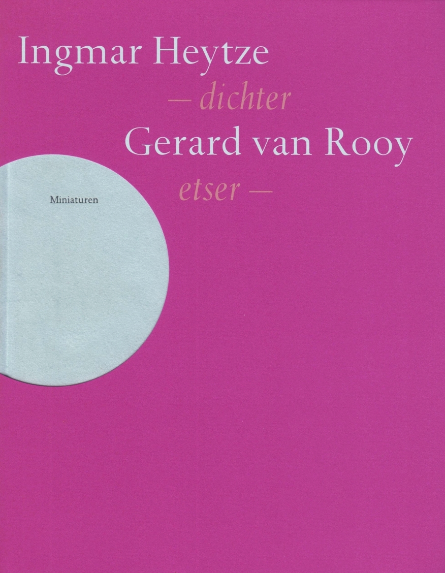 20. HEYTZE, Ingmar Miniaturen. (Met 14 originele etsen door Gerard van Rooy). Utrecht, Stichting De Roos, 2005. Karton, overplakt met Edo Mizu Original lichtblauw fluweel, met stofomslag. 60 p. Typografie Bart de Haas. Gezet uit de Romulus en gedrukt door Alex Barbaix op 150 grams Hahnemühle etspapier in een oplage van 175 genummerde en door dichter en kunstenaar gesigneerde exemplaren. 1e druk.